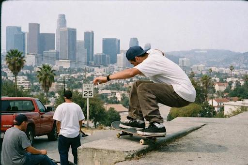 Prompt: Los Angeles landscape skateboarding shot, in the following style: late 90s documentary street photography, shot on 35mm color film, Leica M-style rangefinder camera with 35mm lens, Kodak Portra 400 color panel, natural daylight, soft contrast, soft and realistic colors, embedded film grain, slight edge softening, observational candid composition, no HDR, no modern digital sharpening, no cinematic lighting.