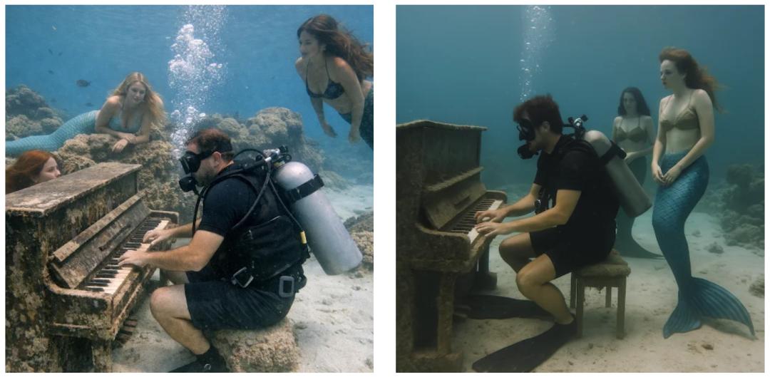 Prompt: A diver plays the piano underwater, with mermaids watching. A hyper-realistic amateur photographic style.