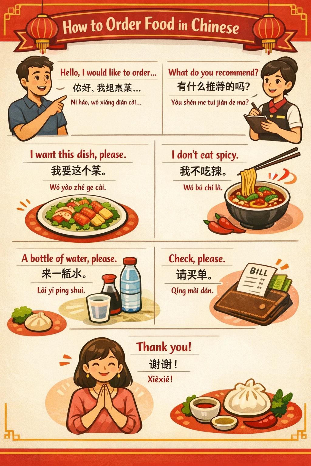 Prompt: Could you draw a diagram listing some common phrases for ordering food in Chinese?