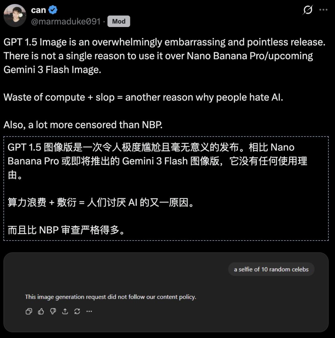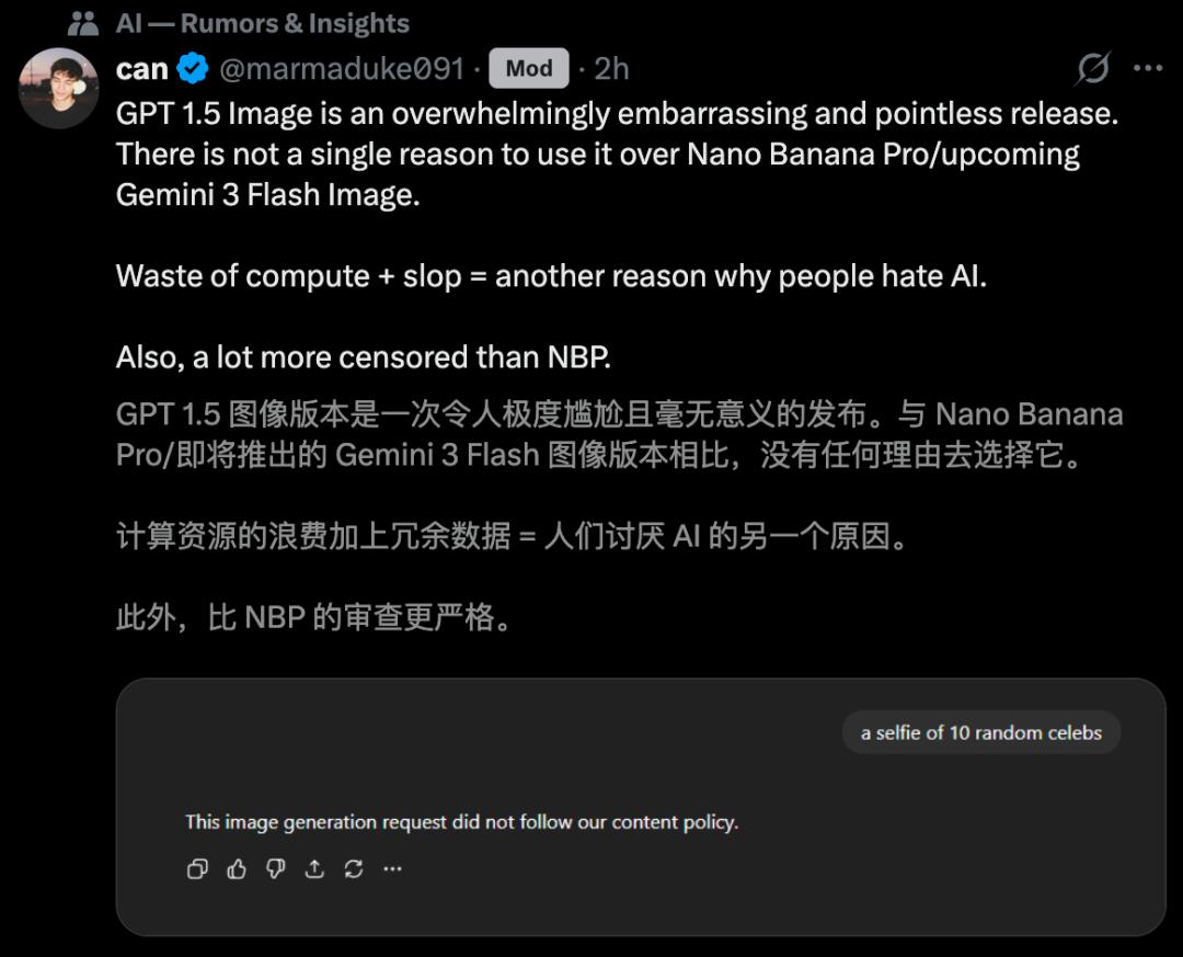 However, netizens who have experienced GPT Image 1.5 and Nano Banana Pro bluntly stated that OpenAI has "run out of ideas" this time:
