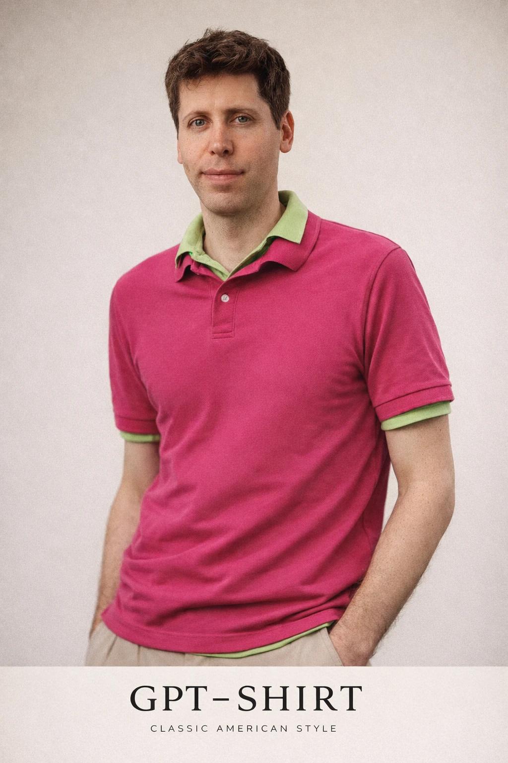 Prompt: Use the uploaded image as the main reference. Transform it into a minimalist 90s American fashion advertisement. Completely preserve the subject's facial features, proportions, pose, and expression. Retain the original color of the double-collar polo shirt. Style: Clean, understated, high-end fashion magazine style. Outfit: Double-layered polo look (one polo layered over another), classic cut, neutral or slightly soft colors. Scene: Seamless studio backdrop, simple composition. Lighting: Soft, even studio lighting with soft shadows; natural skin tone. Mood: Confident, relaxed, and timeless. Brand: GPT-Shirt. Photography Style: Medium format film quality, subtle grain, restrained contrast.