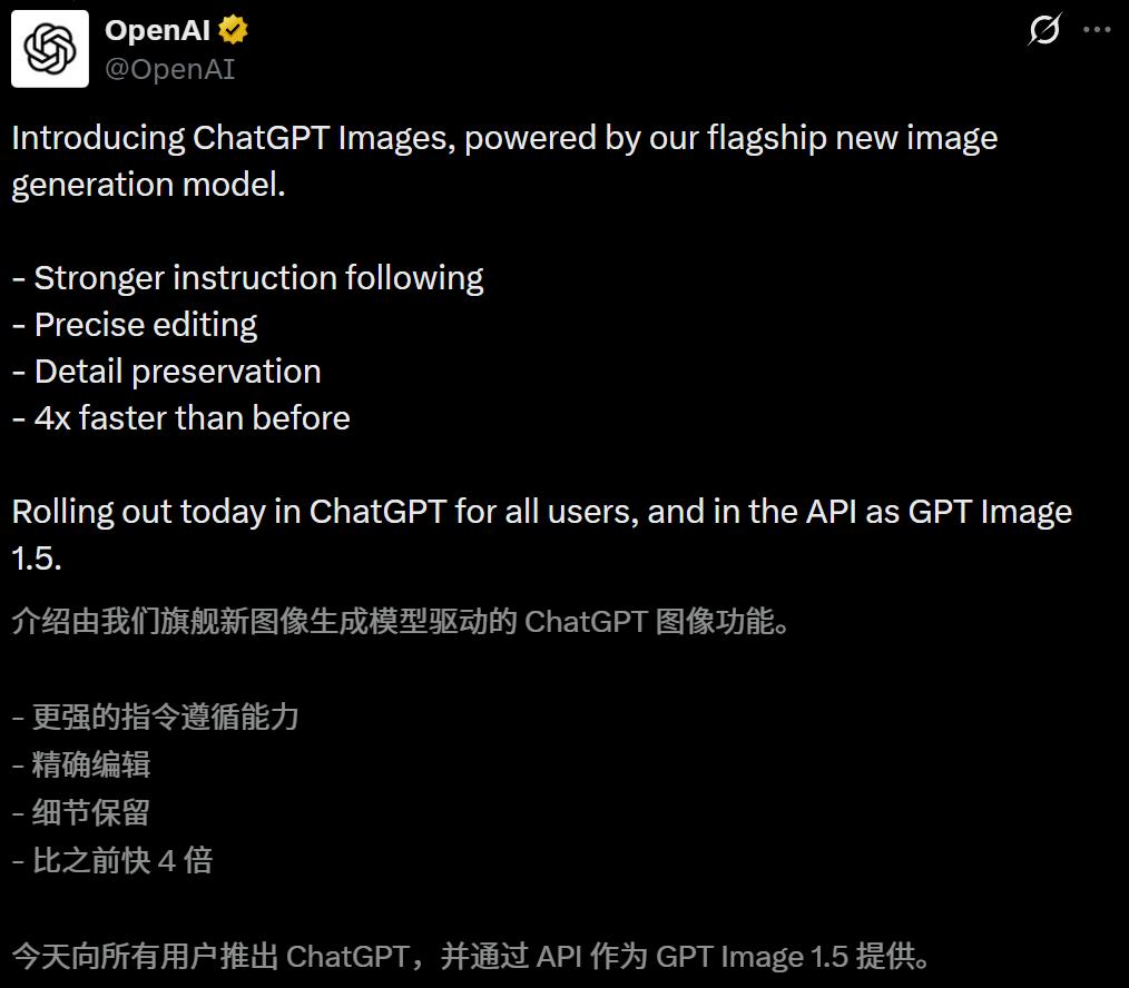 Faced with Google's relentless pressure, OpenAI has quickly accelerated its pace: about five days ago, it released GPT-5.2; now, it has launched an upgraded image model.