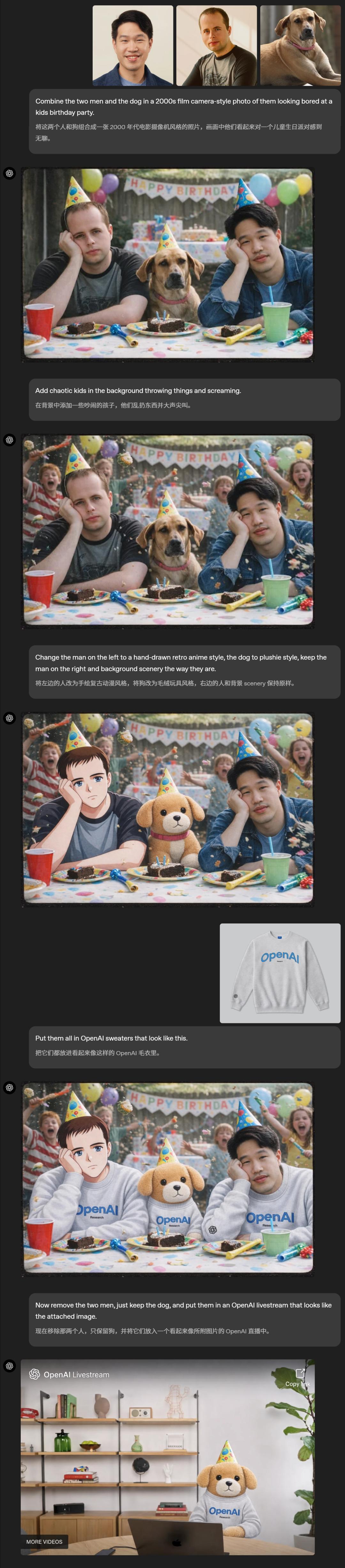 Even more amazing is that ChatGPT can change the background with one click, instantly turning a birthday party into an OpenAI live stream.