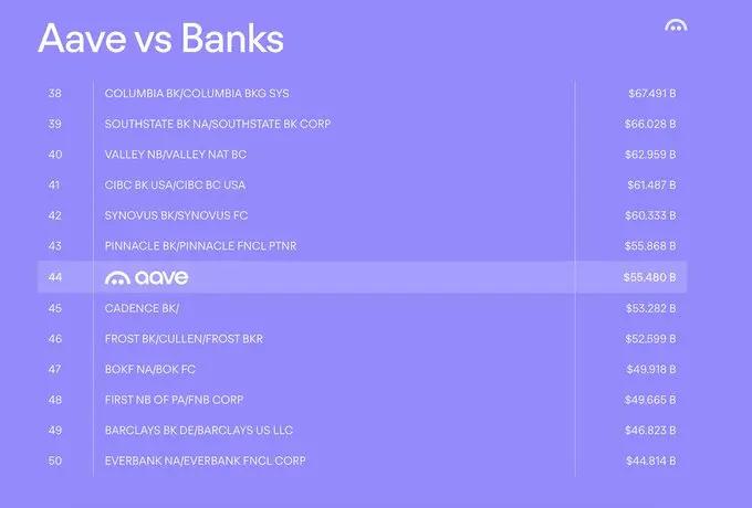 More importantly, in terms of size, the Aave Protocol is now comparable to the top 50 banks in the United States—and the United States is the core hub of the global financial system.