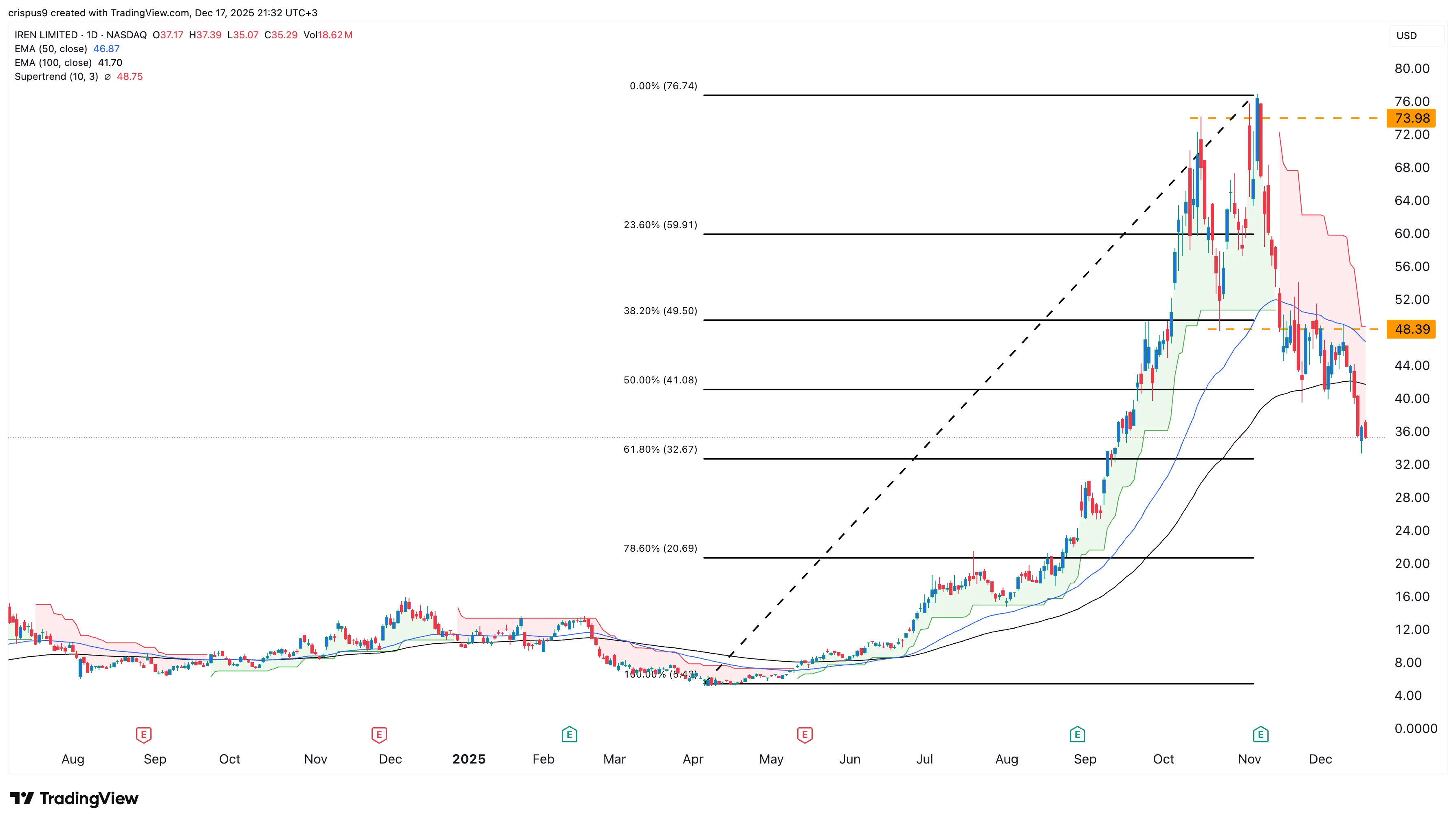 IREN remains below the 50-day and 100-day Exponential Moving Averages, a sign that bears have prevailed. It has dropped below the Supertrend indicator and the key support at $48.40, its lowest point on Oct. 23.