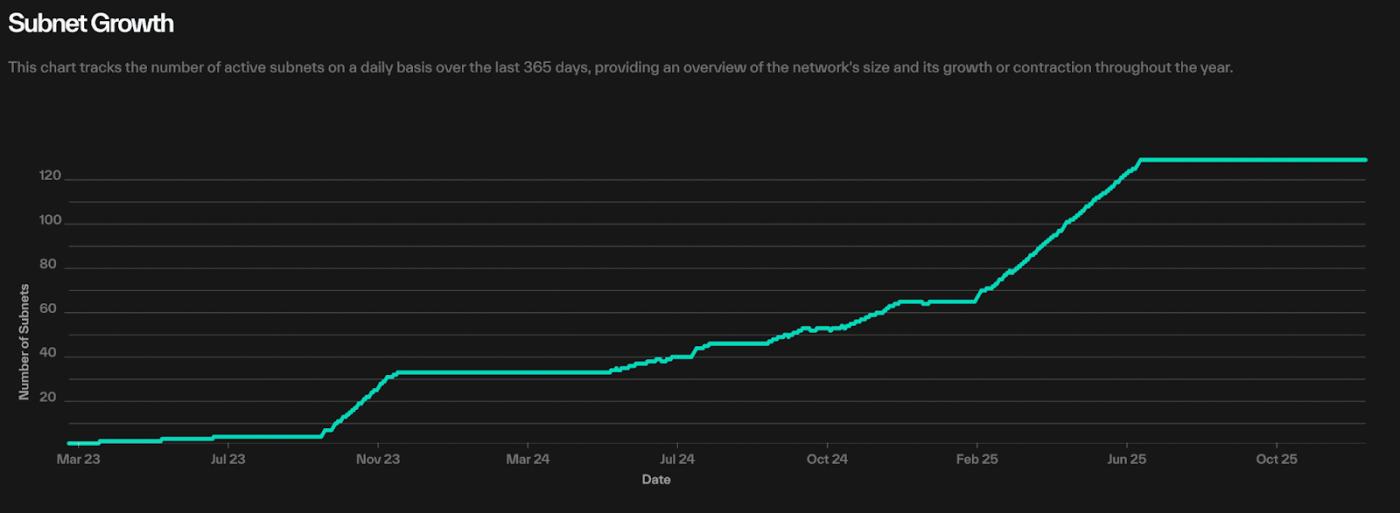 And subnet growth has been strong. Since the start of 2025, the number of subnets has increased 97%, from 65 to 128.
