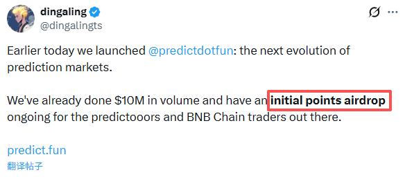 On December 17, dingaling, the founder of the prediction market platform predict.fun, announced on the X platform that the platform has officially opened and airdropped initial points to Meme traders, Aster participants, and active users of various prediction markets on the BNB Chain.