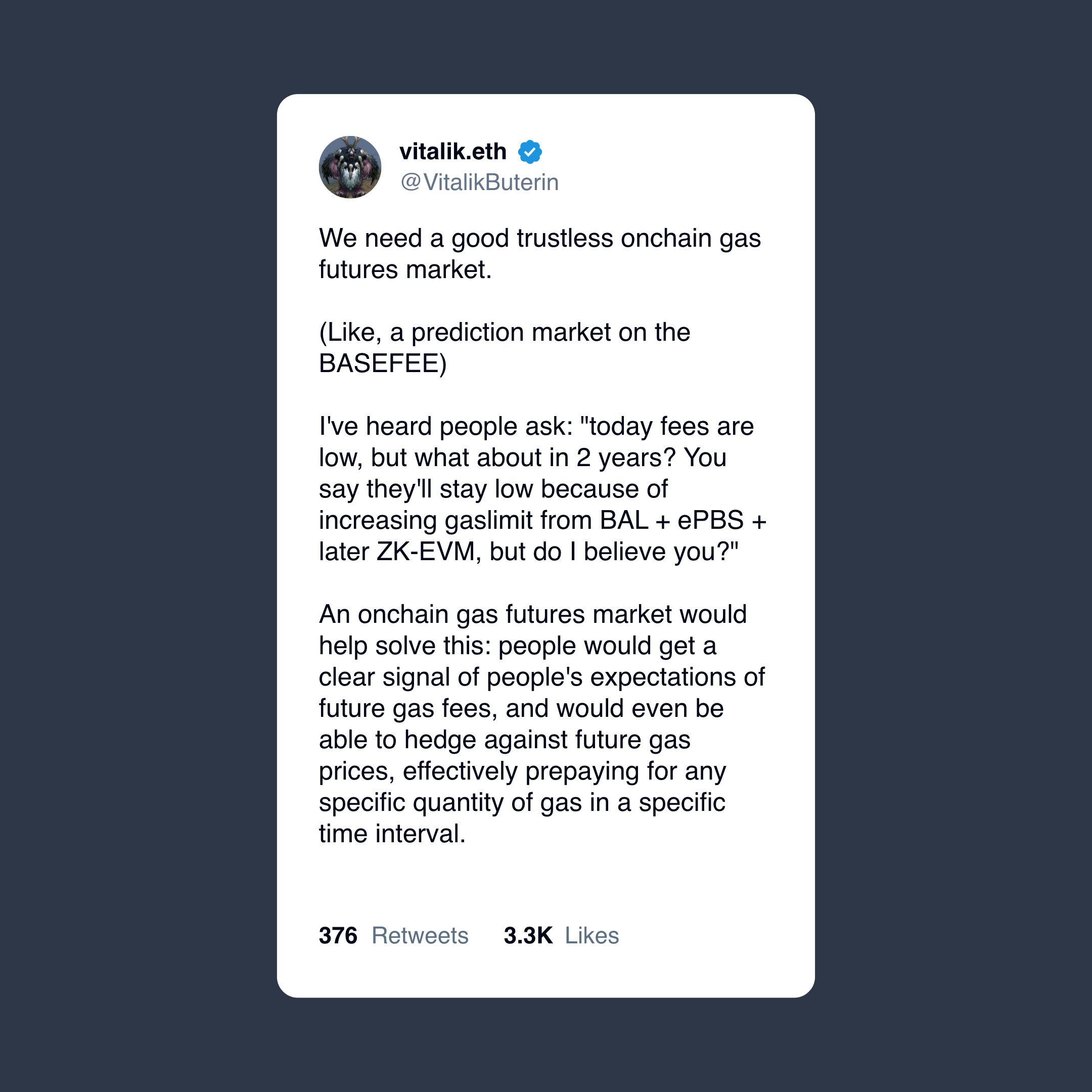The goal of this post is to get a temperature check on whether Ethereum may consider a drastic change to its transaction fee mechanism from EIP-1559 to a gas futures market. It leaves important details like the auction settlement out of scope. Still, we highlight some important future considerations here.