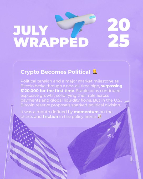 DAY 7 and July was loud. 🔥 The month saw Bitcoin smashing through $120k for the first time ever. Stablecoins kept booming quietly. And U.S. politicians? Debating BTC as state reserves. Crypto didn’t just go higher, it went mainstream.