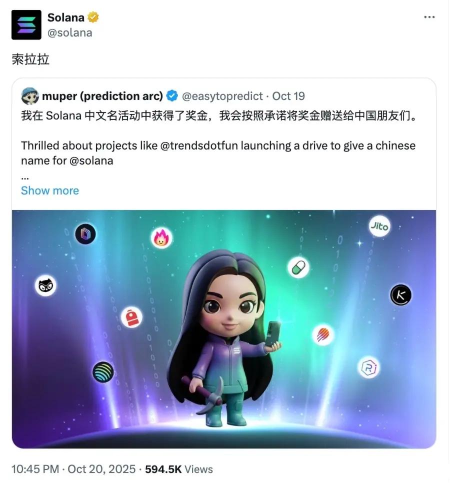 The story began with a Chinese name contest for Solana: In mid-October, the content platform Trends.fun launched a "Give Solana a Chinese Name" campaign, attracting a large number of Chinese-speaking users to contribute their ideas. Within just a few days, the name "索拉拉" (Suo La La) stood out, not only because it was easy to pronounce, but also because its creator imbued it with an interesting image—a long-haired female builder, symbolizing every builder who strives on Solana.