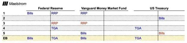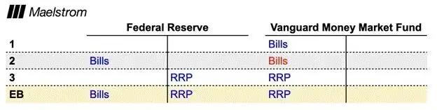 1: The Federal Reserve creates RRP balances by printing money and purchasing Treasury bills from Vanguard Group.