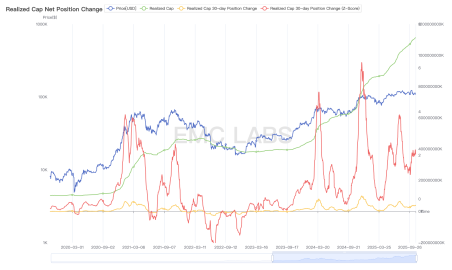 The first large-scale inflow of funds stemmed from the approval of the BTC ETF, while the second large-scale inflow came from the election of "crypto-friendly president" Trump. The third largest value realization in this bull market occurred between March and July 2025, driven by the easing of the US-China trade war and expectations of a Federal Reserve interest rate cut. However, this inflow abruptly stopped after pushing the price of BTC to $120,000.