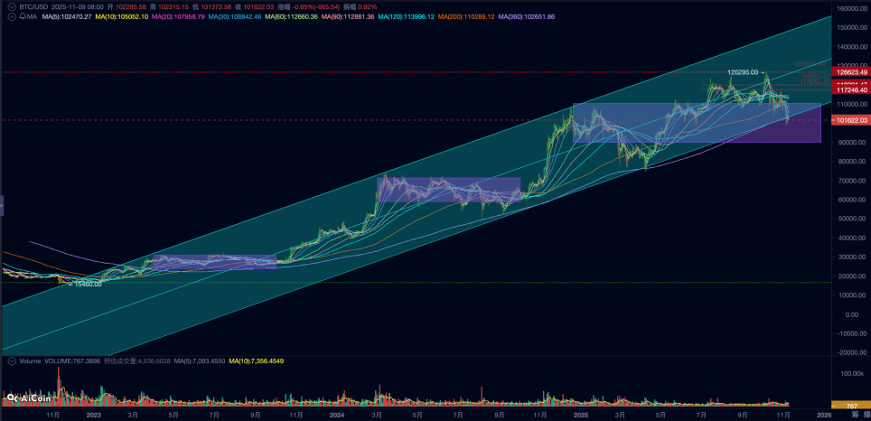 Technically speaking, the price broke below the $100,000 mark during Tuesday's sharp drop and fluctuated around this price for most of the remaining time. This price also coincides with the 360-day moving average. This price is also the lower edge of the upward channel we've been monitoring for this bull market. If the price breaks below this level, technically, this round of the BTC bull market will officially end.