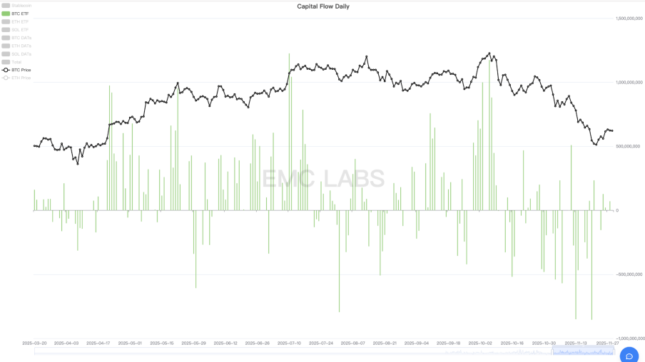 In early October, BTC ETFs saw a large inflow of funds, pushing BTC to a new all-time high. Subsequently, following the Federal Reserve's market liquidity injection, the inflow of funds plummeted and began to turn into outflows, which have been the main trend since then.