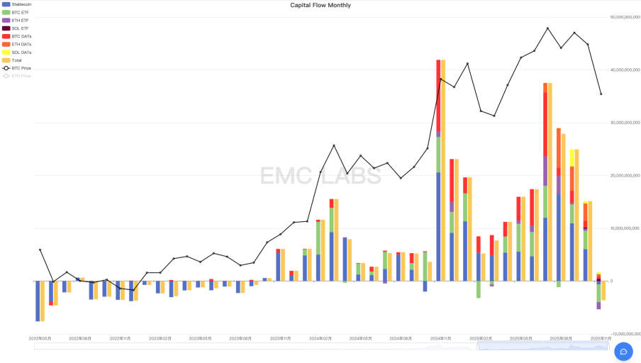 First, according to eMerge Engine's statistics on the overall cryptocurrency market fund flows, we can see that the cryptocurrency market recorded an outflow of over $3.6 billion in November. Specifically, the BTC ETF channel saw $3.382 billion, the ETH ETF channel $1.352 billion, stablecoins $615 million, and the SOL ETF recorded a positive inflow of $412 million. Overall, the BTC/ETH/SOL treasury companies recorded positive inflows, totaling approximately $1.298 billion.