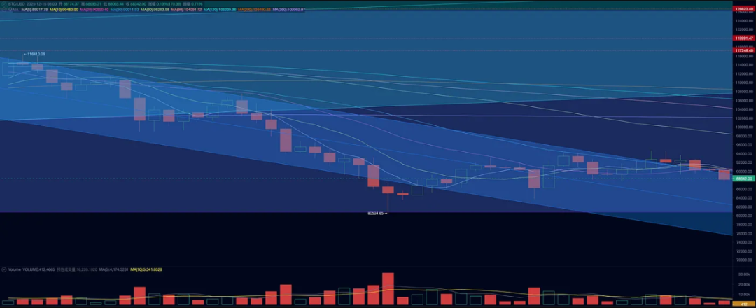 This week, BTC opened at $90,402.30 and closed at $88,171.61, a decrease of 2.47% with a volatility of 7.83% and a slight decrease in trading volume. Technically, BTC broke through the downward trend channel before the interest rate cut, but subsequently gave back all of that momentum due to the impact of AI stock earnings reports.
