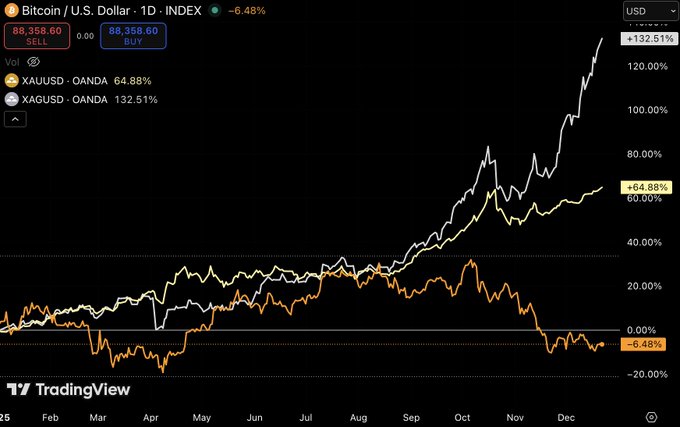NEW: GOLD UP 64.9% AND SILVER UP 132.5% THIS YEAR, AS BOTH HIT NEW ALL-TIME HIGHS - BITCOIN DOWN 6.5% THIS YEAR