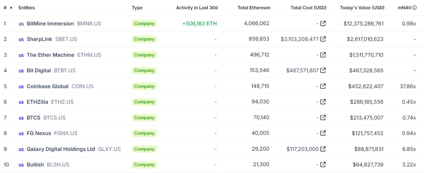 Top 10 Ethereum Treasury Companies as of December 2025. Source: CoinGecko