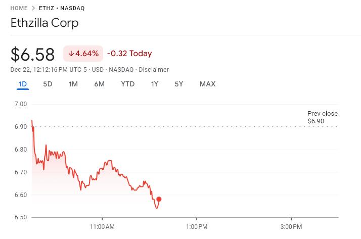 ETHZilla Stock Nosedives Nearly 5% After Selling Announcement. Source: Google Finance