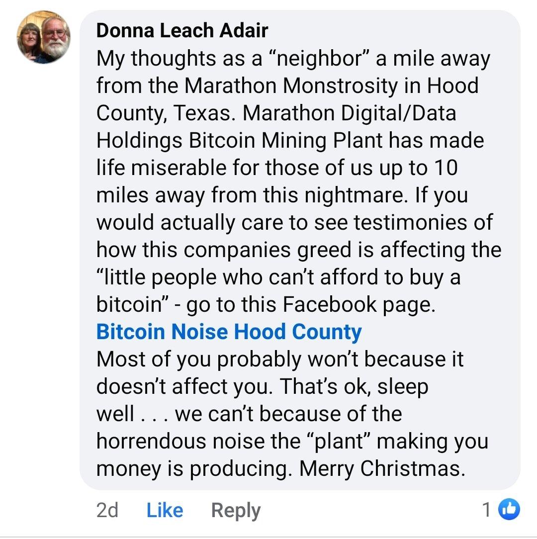A Resident’s Comment on the Hood County Bitcoin Mining Situation“This is a sound that blasts me every day when I walk out of my back door,” one resident said in a recent Al Jazeera report. Others described sleepless nights, headaches, and stress. “The community is sick,” another resident said. “More than just noise, it’s a physical bombardment. It’s torturous.”