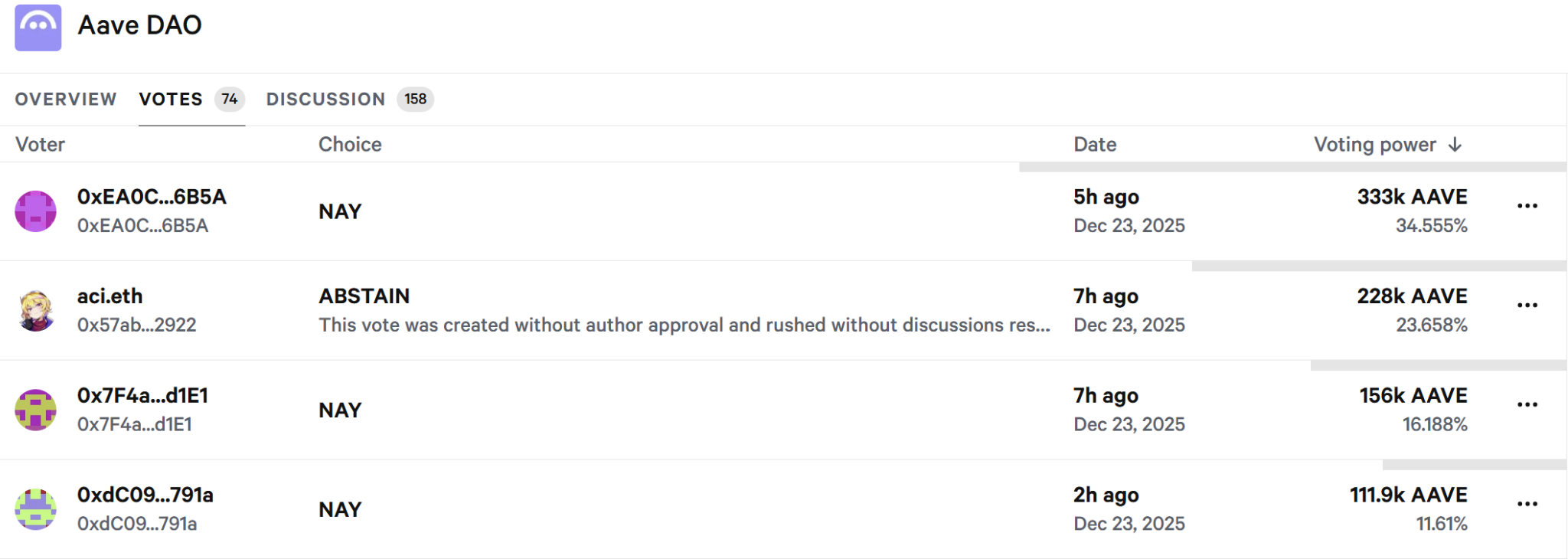 The ABSTAIN vote is led by Aave Chan Initiative (ACI), a leading Aave DAO service provider, who stated, “This vote was created without author approval and rushed without discussions resolved. Real vote will happen when discussion reaches more maturity.”