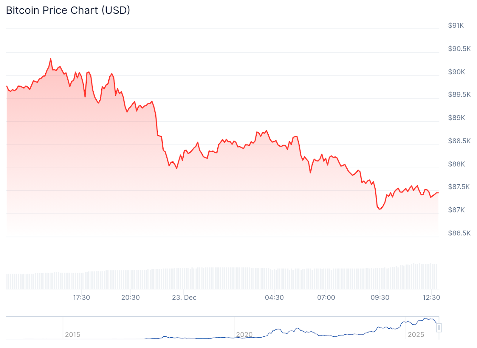 Bitcoin (BTC) is trading around $87,383, down about 2.4% on the day, while Ethereum (ETH) is holding near $2,957, down roughly 2.7%.