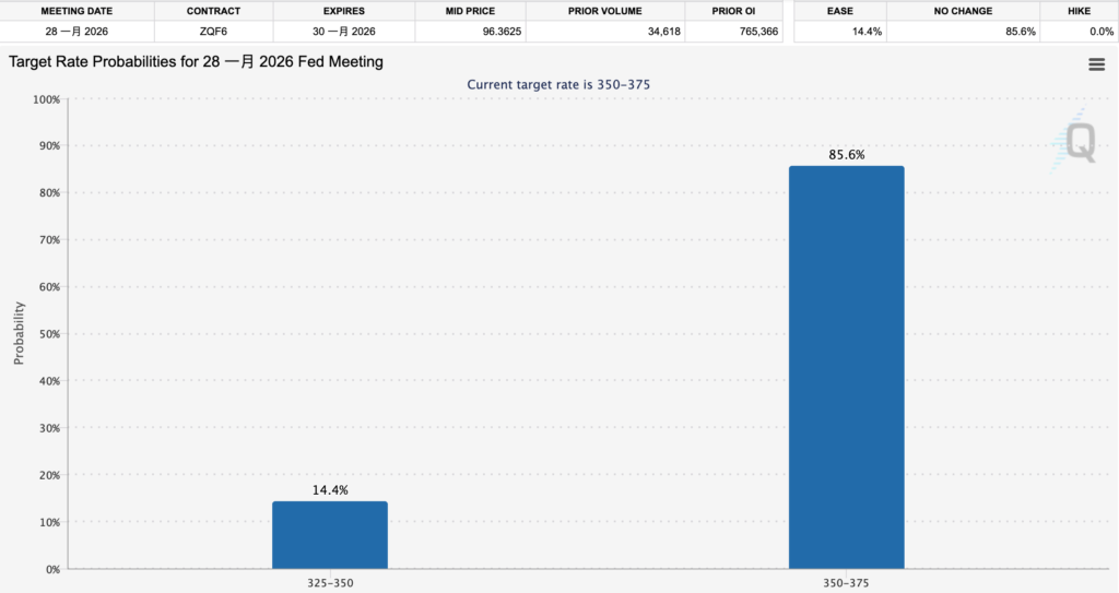 According to CME FedWatch data, the probability of the Federal Reserve maintaining the current interest rate range of 3.5% to 3.75% has climbed to 85.6% , while the expectation of a 25 basis point rate cut has dropped to only 14.4%. This shift echoes the modest rebound following the release of the November CPI, indicating that inflation has not yet fallen below the Fed's target range.