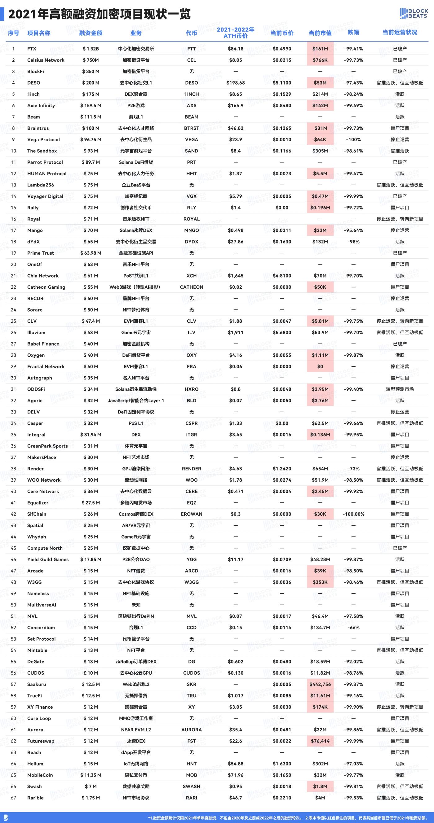 Note: This table includes 67 representative cases from the top 400 projects in terms of funding amount in 2021 that have either gone bankrupt, reached zero, or had low operational activity, with a total funding amount exceeding US$5 billion. Funding amount statistics are limited to funding rounds in 2021 alone and do not include funding rounds in 2020 or earlier, or after 2022. Projects marked with market capitalization in red in the table represent projects whose current market capitalization is lower than their total funding amount in 2021.