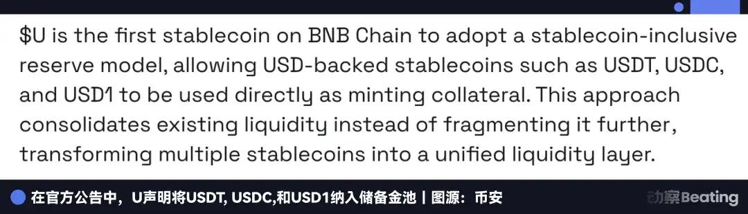 U's design logic is completely different from the previous two: it does not directly compete with USDT, USDC, or USD1, but instead incorporates them all into its own reserve pool. In a sense, U is a "stablecoin of stablecoins," or a "stablecoin ETF."
