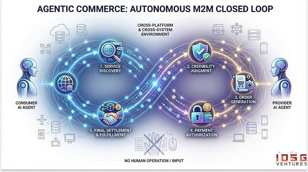 Agentic Commerce refers to a full-process commercial system where AI agents autonomously complete service discovery, credibility judgment, order generation, payment authorization, and final settlement. It no longer relies on step-by-step human operation or information input, but rather involves agents automatically collaborating, placing orders, paying, and fulfilling in a cross-platform and cross-system environment, thereby forming a commercial closed loop of autonomous execution between machines (M2M Commerce).