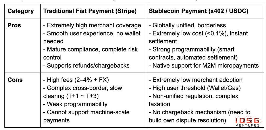 In the Agentic Commerce system, the real-world merchant network is the largest value scenario. Regardless of how AI Agents evolve, the traditional fiat payment system (Stripe, Visa, Mastercard, bank transfers) and the rapidly growing stablecoin system (USDC, x402) will coexist for a long time, jointly constituting the base of Agentic Commerce.