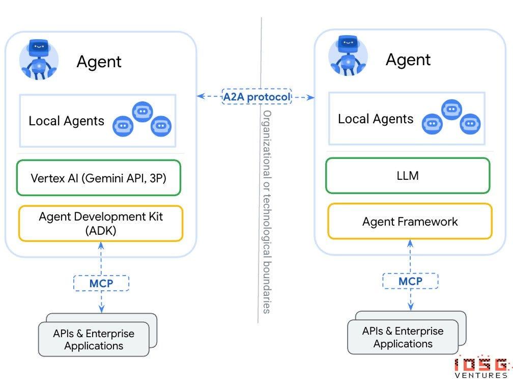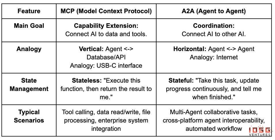 - A2A solves “How Agents collaborate with other Agents” — establishing native communication standards for cross-vendor, cross-framework agents, supporting multi-turn dialogue, task decomposition, state management, and long-lifecycle execution. It is the basic interoperability layer between agents.