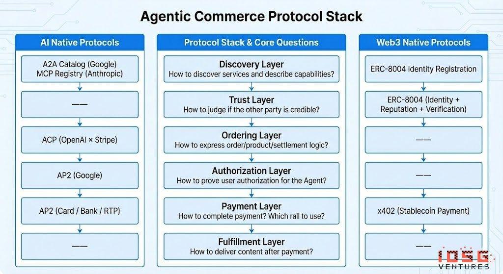 The protocol stack of Agentic Commerce consists of six layers, forming a complete machine commerce link from “capability discovery” to “payment delivery”. A2A Catalog and MCP Registry are responsible for capability discovery, ERC-8004 provides on-chain verifiable identity and reputation; ACP and AP2 undertake structured ordering and authorization instructions respectively; the payment layer is composed of traditional fiat rails (AP2) and stablecoin rails (x402) in parallel; the delivery layer currently has no unified standard.