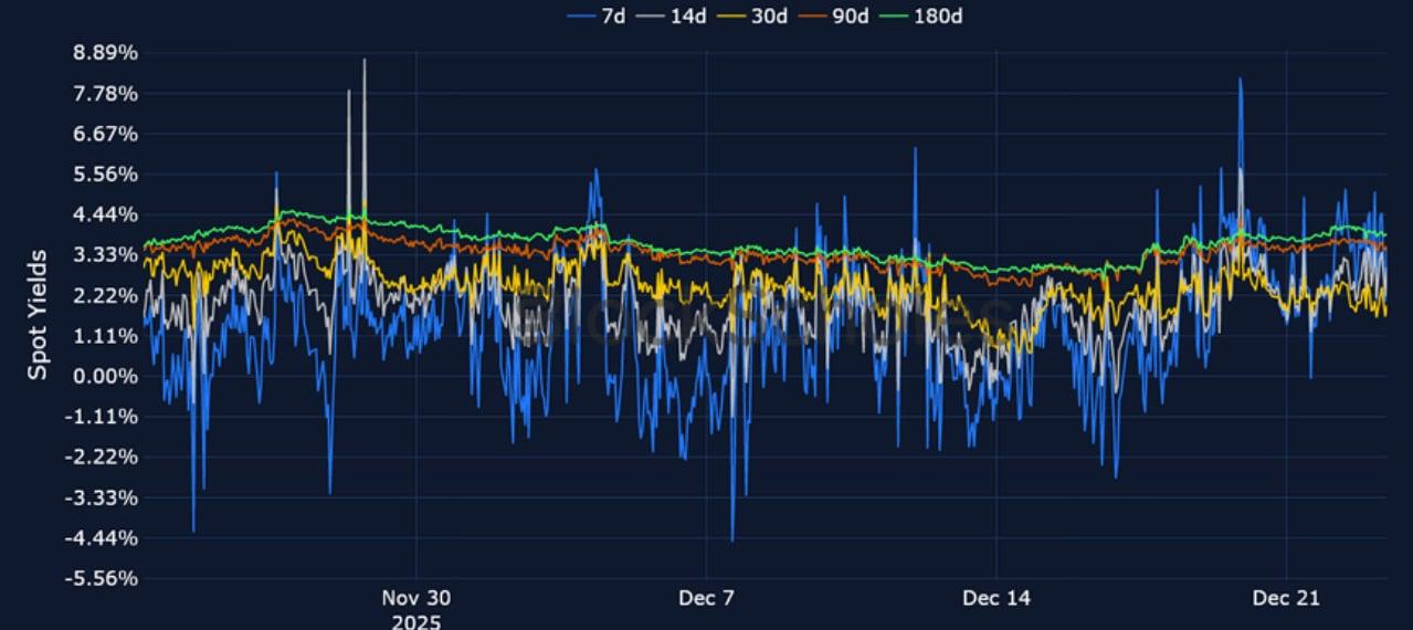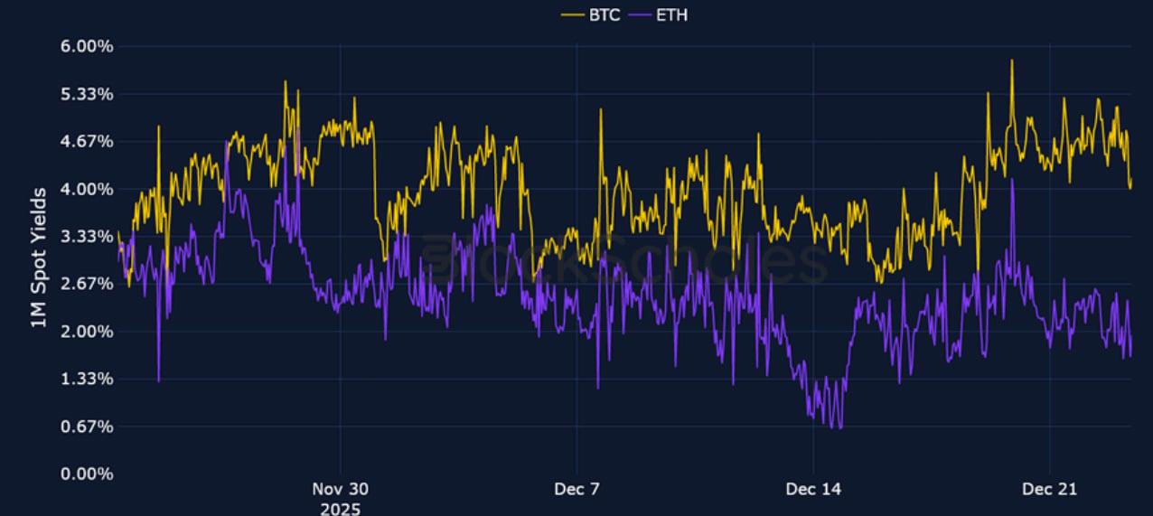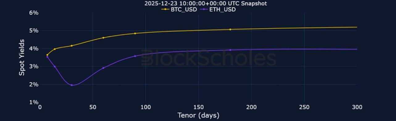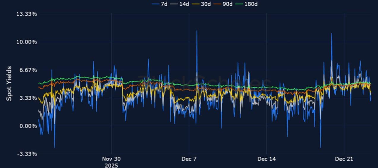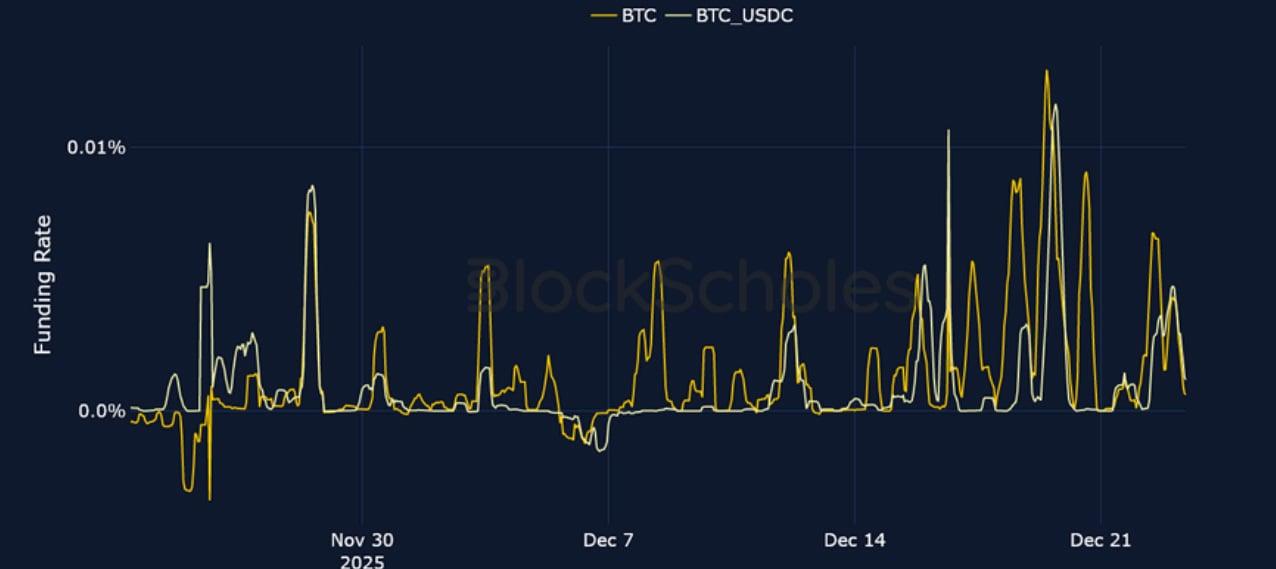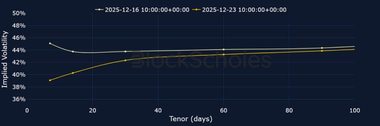 Similar to last week, derivatives markets point towards slightly differing levels of sentiment in the two majors. ETH funding rates shot up to their highest level since late November on Monday Dec 22, 2025 after reclaiming $3,000, though collapsed back to neutral levels just as quickly. However, futures markets point to a slightly higher pricing of BTC futures compared to ETH. On the other hand, despite option’s markets being bearish for both tokens heading into the new year and beyond, ETH volatility smiles assign a slightly less negative put-call skew premium at all tenors on the volatility smile. Expectations for volatility in options markets have also dropped – mirroring a similar decline in TradFi markets, with both the VIX index and the MOVE index close to their year-to-date lows. Finally, despite a relatively flat spot price over the past seven days for both BTC and ETH, our in-house Risk Appetite Index is increasingly showing signs of a bottom being reached, with risk-appetite now having bounced from historically low levels.