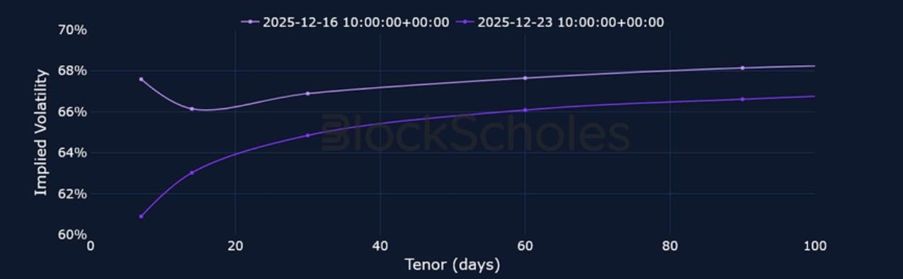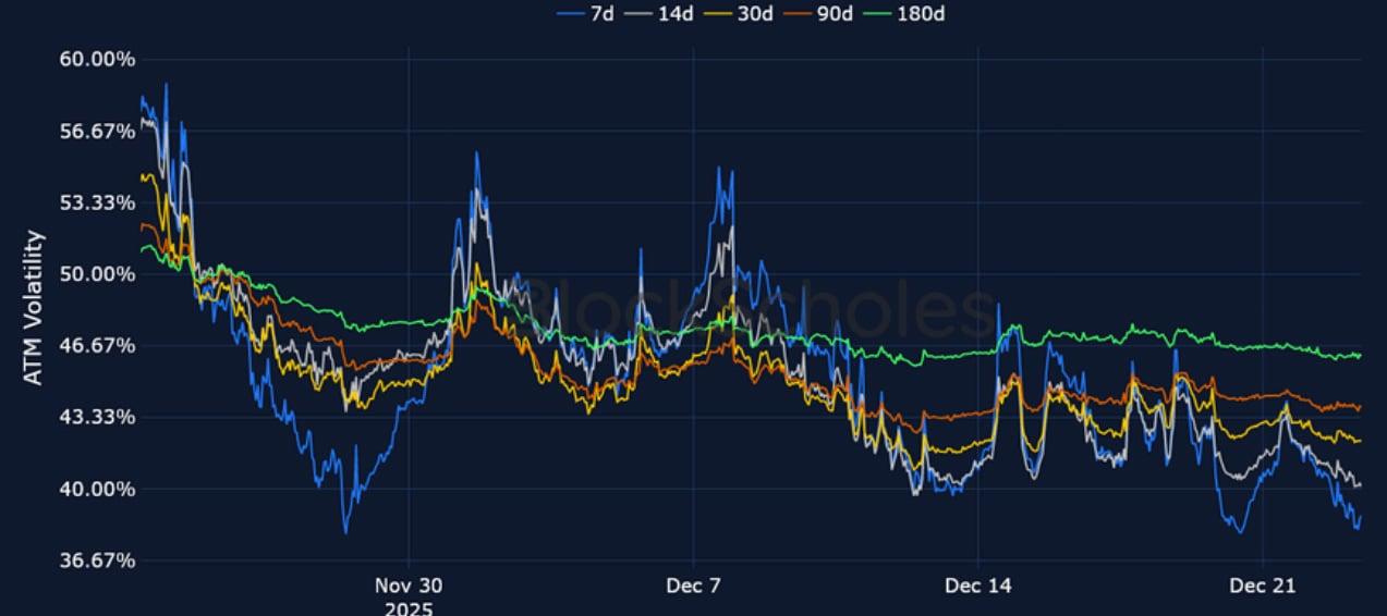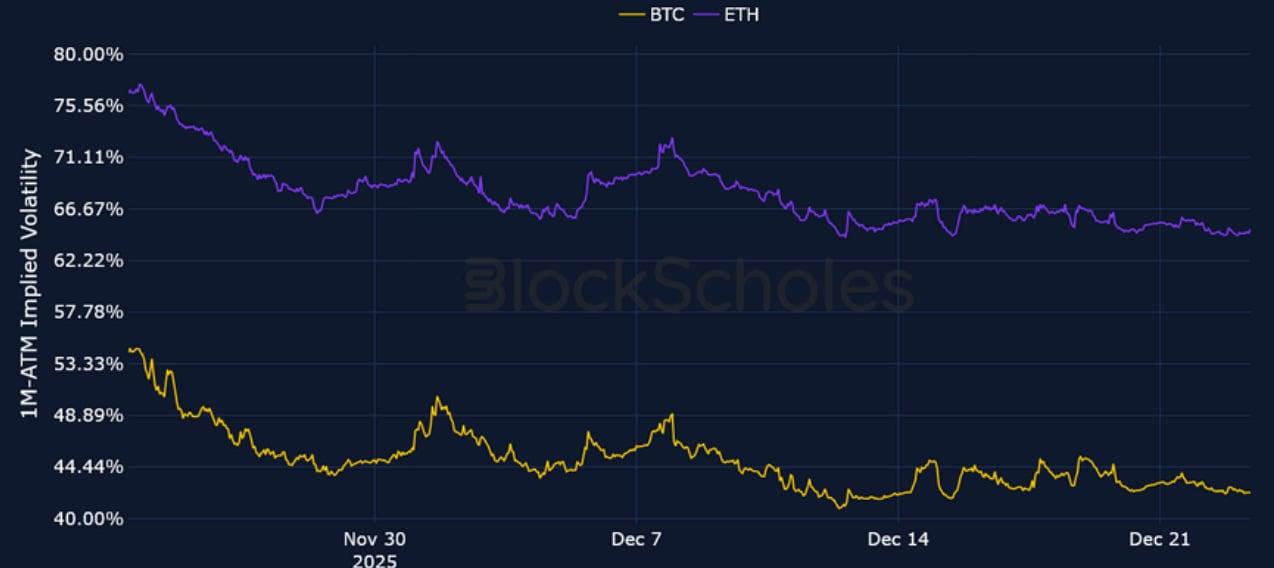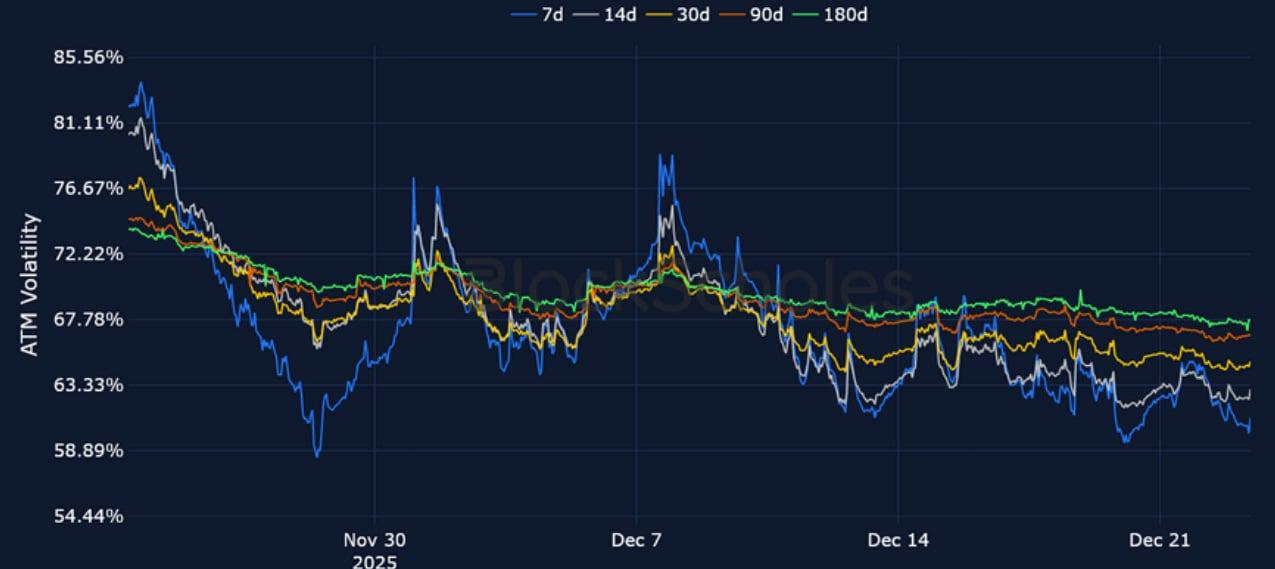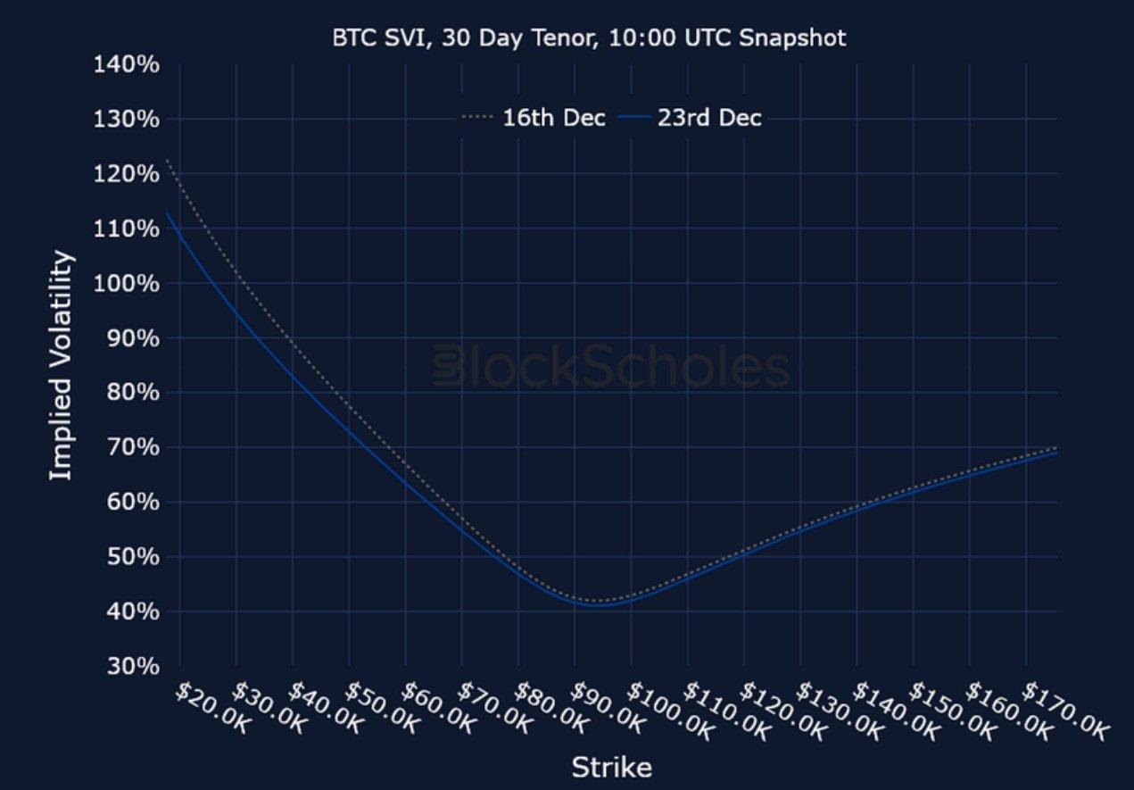 BTC SVI ATM IMPLIED VOLATILITY – Short-tenor IV has continued to fall lower as we head into the new year and is now 20 points below late November levels.