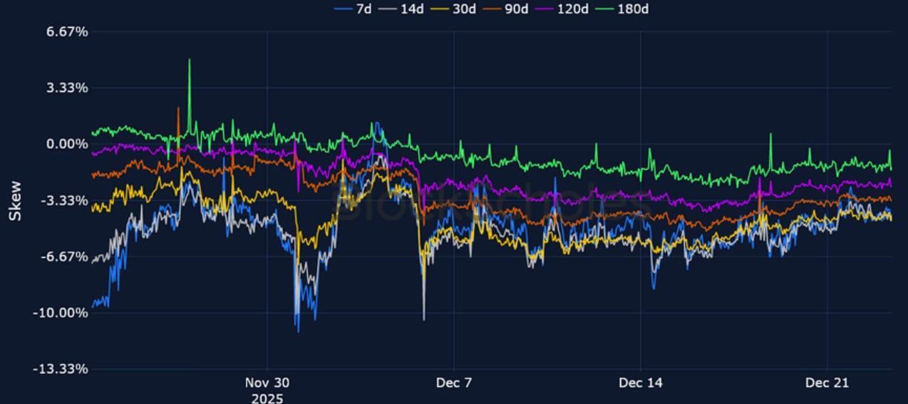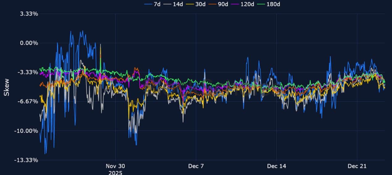 BTC 25-Delta Risk Reversal – While a Santa rally may be on the cards for US equities, BTC options markets maintain a bearish put premium at all tenors.
