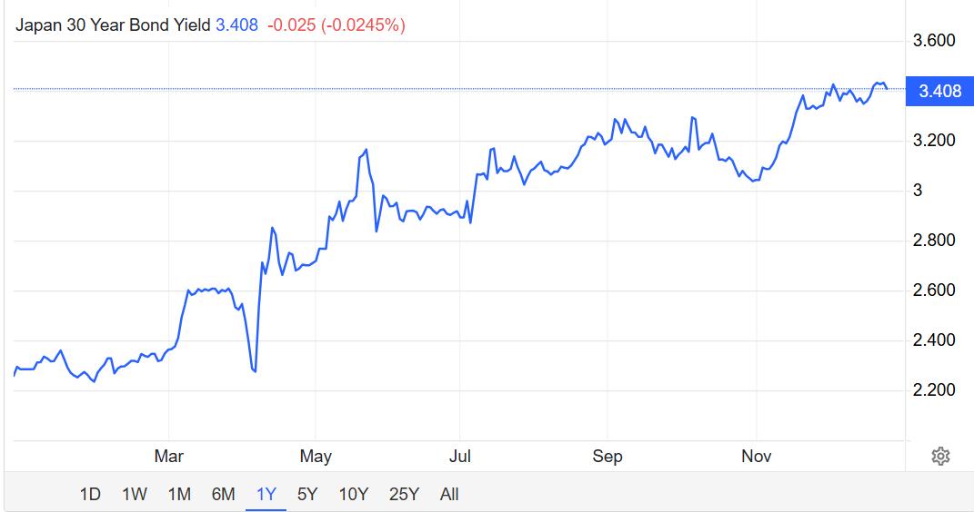 The yield on Japan’s 30-year government bond rose to approximately 3.45%, marking an all-time high. At the same time, the 40-year yield climbed to around 3.715%. This was not a single-day spike, but the continuation of a steady upward trend that began in early November. As yields rose, prices of ultra-long-dated bonds declined noticeably, and the far end of the yield curve shifted upward.