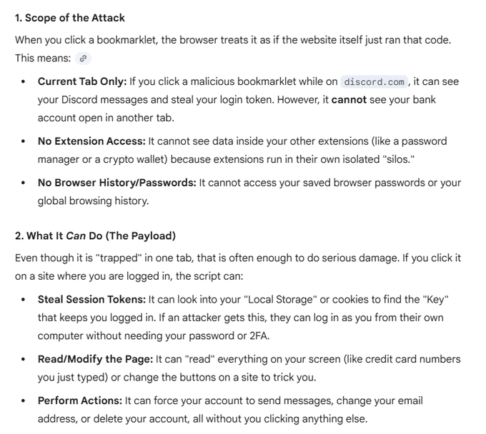Just in case anyone is not aware, bookmarklet exploits have been a thing for years and you are basically running arbitrary javascript on your browser window that can steal any vulnerable information on the tab open