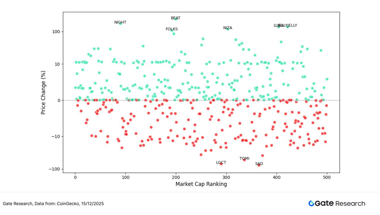 To observe the structural characteristics of token performance in this round of market activity, this article presents a scatter plot of the top 500 tokens by market capitalization. The horizontal axis represents market capitalization ranking (the further to the left, the larger the market capitalization), and the vertical axis represents the price change from December 2nd to December 15th. Each dot in the plot represents a token, with green indicating an increase and red indicating a decrease.