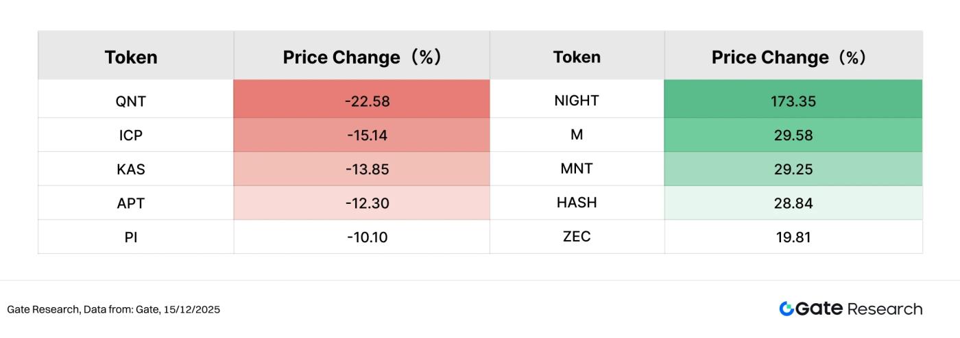 In terms of gains, NIGHT (+173.35%) significantly outperformed the top 100 tokens by market capitalization, becoming one of the few mainstream tokens to record a substantial increase. This reflects the concentrated attention that privacy computing and compliant blockchain narratives have received from investors during the current market recovery. Following closely behind, M (+29.58%) and MNT (+29.25%) showed relatively stable performance, while HASH (+28.84%) and ZEC (+19.81%) also recorded double-digit gains, indicating that computing power, infrastructure, and privacy-related assets have some resilience amid risk aversion. Overall, while the number of rising projects among the top 100 by market capitalization was limited, the gains were highly concentrated, exhibiting a characteristic of "a few strong performers, not widespread gains."