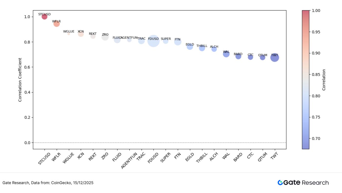 As can be seen from the chart, the correlation of most tokens is concentrated in the range of 0.65–0.85, indicating that in the current market, price fluctuations are still largely driven by trading activity, but they do not show a fully consistent and strong synchronous state, reflecting that the behavior of funds has become somewhat stratified.