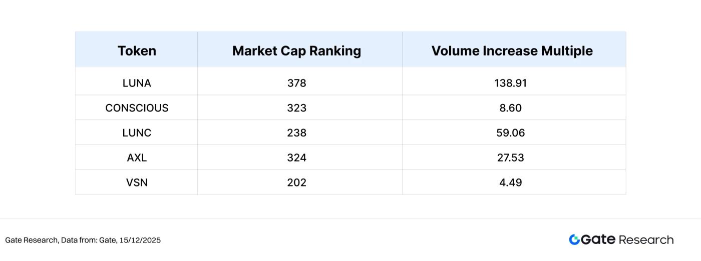 In areas where both increased volume and price increases occur simultaneously, only a few tokens stand out. Among them, LUNA exhibited a typical "increased volume + strong rebound" structure, with its trading volume increasing more than 100 times while its price rebounded by over 100%, indicating that short-term funds concentrated their entry at low levels and formed a phased consensus. LUNC also showed a high increase in trading volume and a double-digit price increase, but its price elasticity was slightly weaker than LUNA's, reflecting more of a rebound and recovery under high-frequency trading.