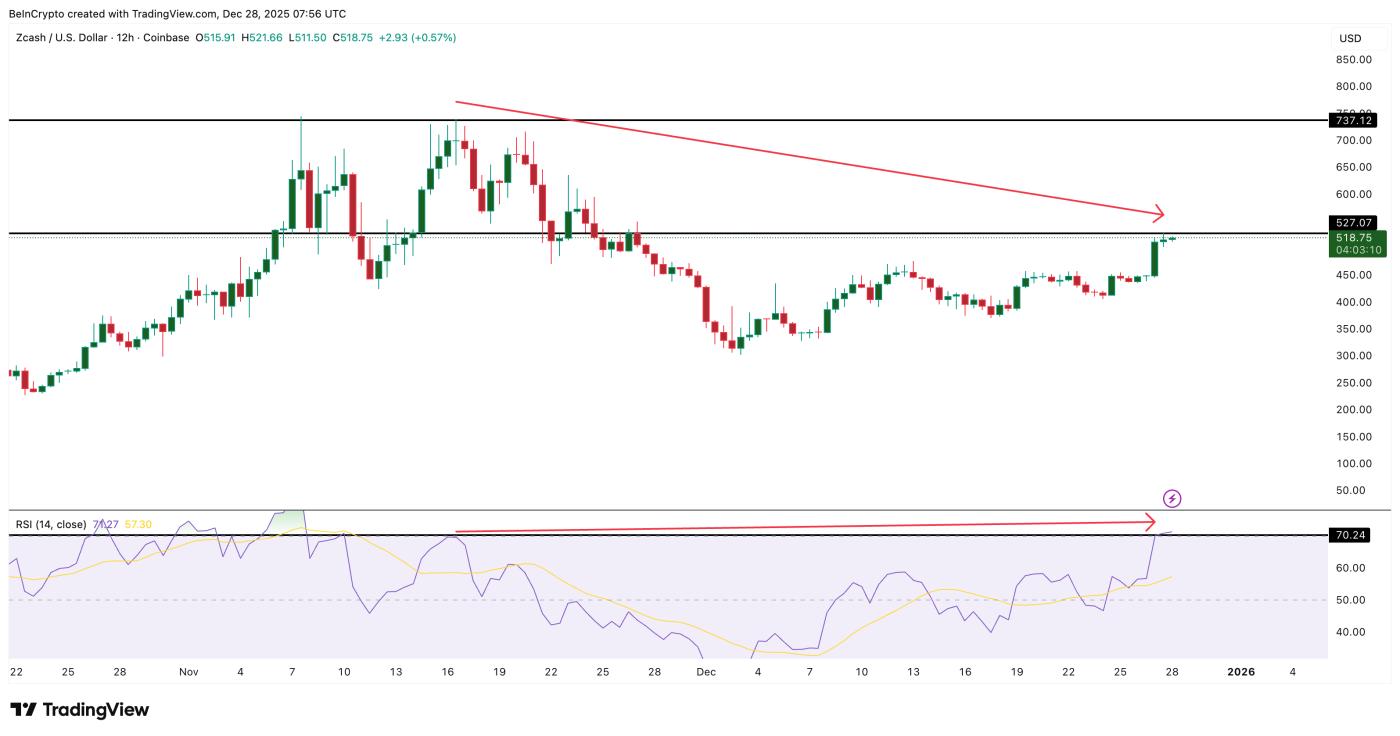 On the 12-hour chart, the price of ZEC formed a lower high between November 16th, 2023 and November 27th, 2023, while the Relative Strength Index (RSI) edged slightly higher. The RSI measures price momentum, and this phase shift is a sign of potential negative divergence – often appearing before minor corrections.