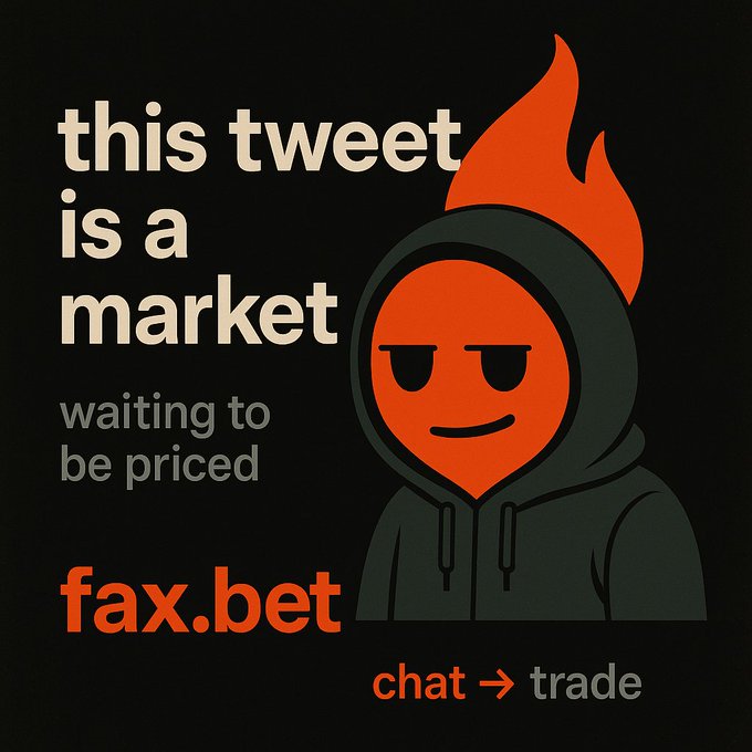 $FAX is live. CA: 6F69uxJSwD6g5M9YQYMivFP5cG1jMm8a8YNd8FKzpump Tokenise tweets. Trade engagement. Long / short attention. Create markets. Earn revenue. Backed by USDC. http://fax.bet http://telegram.me/faxdotbet https://fax-bet.gitbook.io/fax.bet