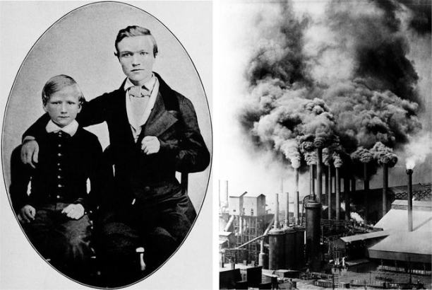 Left: Young Andrew Carnegie and his brother. Right: Pittsburgh steel mills during the Gilded Age.
