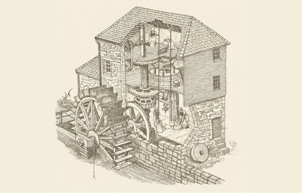 A mill powered by a waterwheel. Water power is powerful but unstable and limited by location and season.