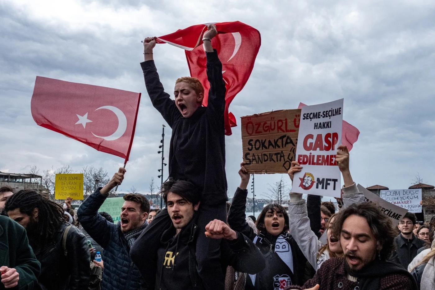 University students wave Turkish flags and signs during a demonstration after Istanbul Mayor Ekrem Imamoglu was detained. Photo: Kerem Uzel/Bloomberg