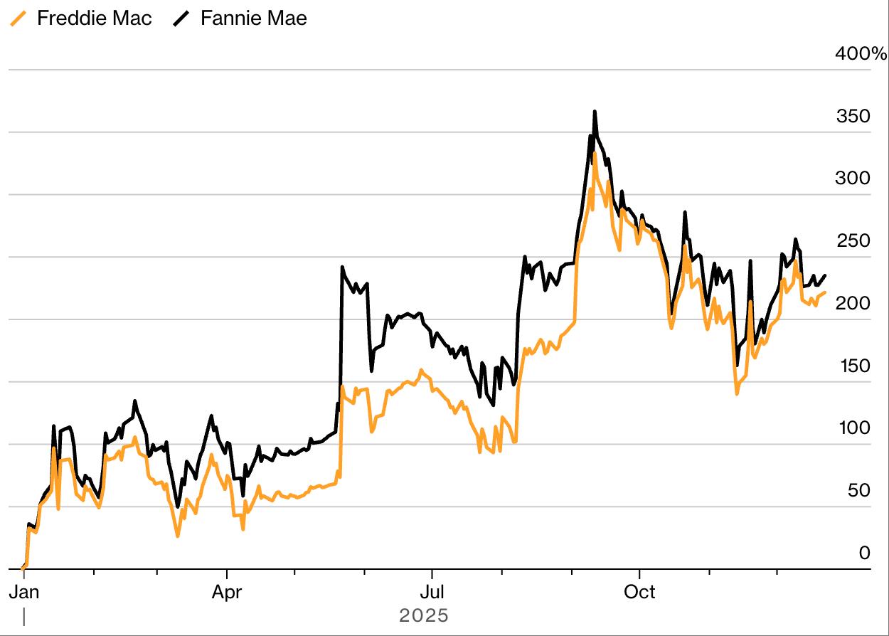 Fannie Mae and Freddie Mac shares surged on privatization expectations.