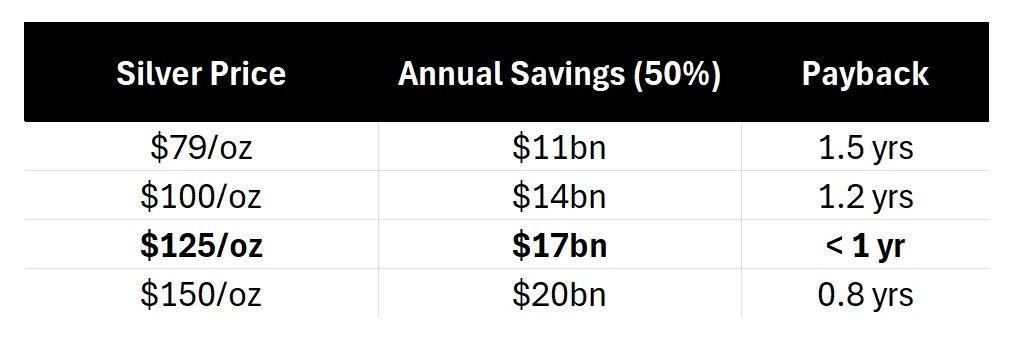 When silver prices reach $125/oz , the payback period for copper substitution will shorten to less than a year , at which point every board meeting will likely revolve around copper substitution. However, even if all companies make their decisions tomorrow, achieving 50% copper substitution will still take four years . Meanwhile, $125/oz will still be 50% higher than current spot prices.